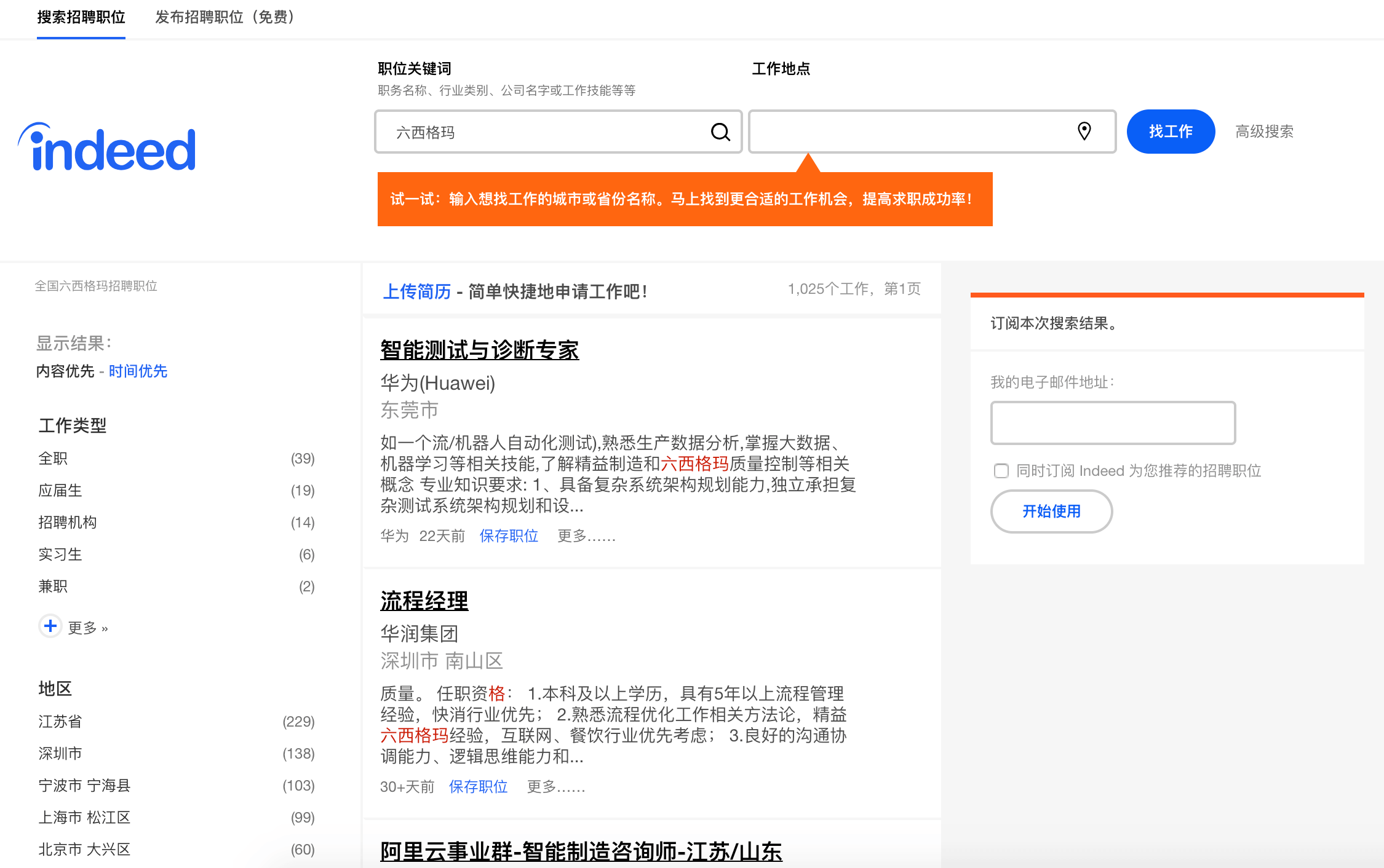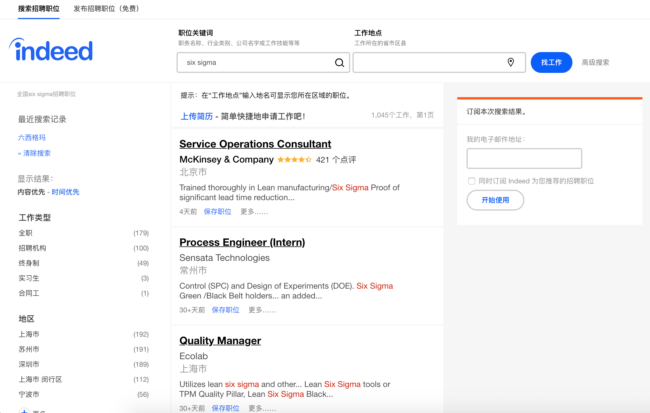 我们在Indeed.com在中国区域做了同样的调查,分别使用了“Six Sigma“ 和 “六西格玛” 作為關鍵詞,合共得到2000+個搜索結果。
