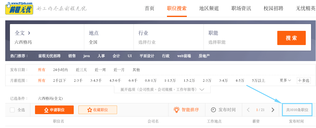 在前程无忧 网站上,我们尝试了输入“六西格玛”作为关键词,结果是在最近的职位空缺中,竟然共有超过1000+个空缺提及“六西格玛”一词,其影响力不容置异。