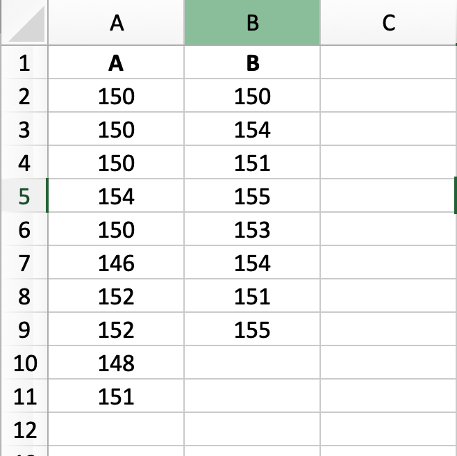 第1步:将两组数据分成两列,输入到Excel表格。