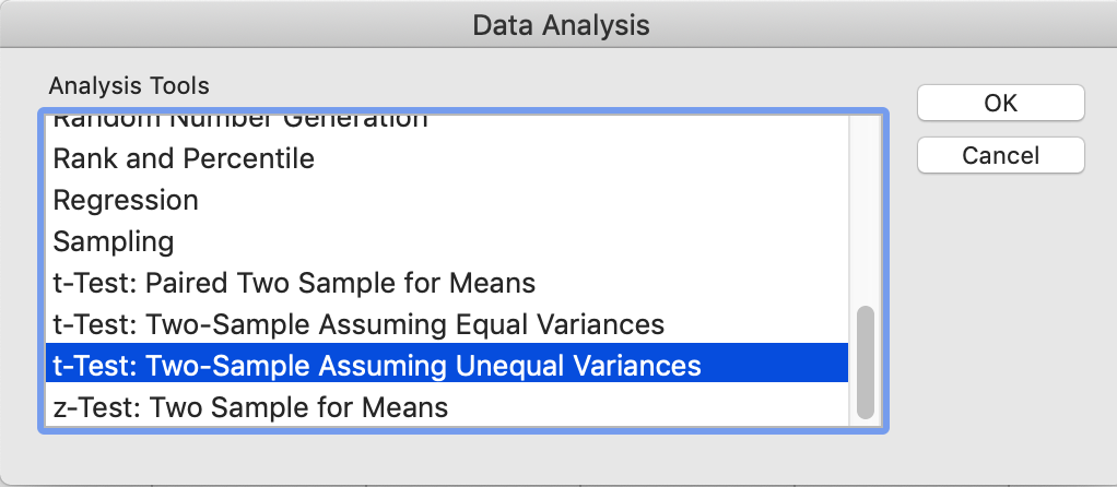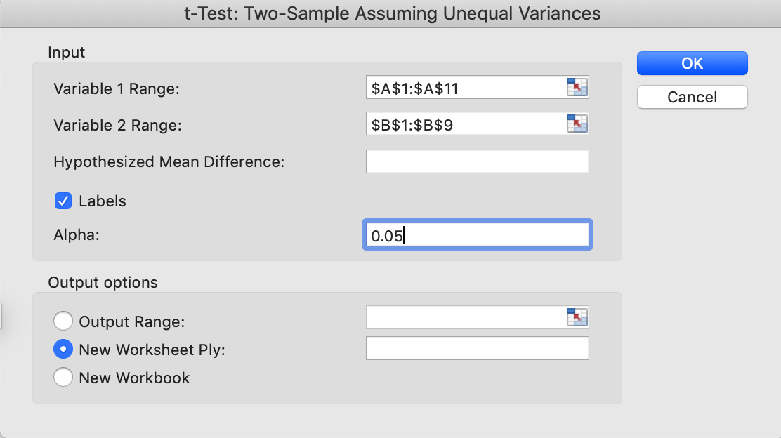 第3步:t-Test: Select Two-Sample assuming unequal variances (t-检验:双样本,假设两组数据的分散程度不相等)
