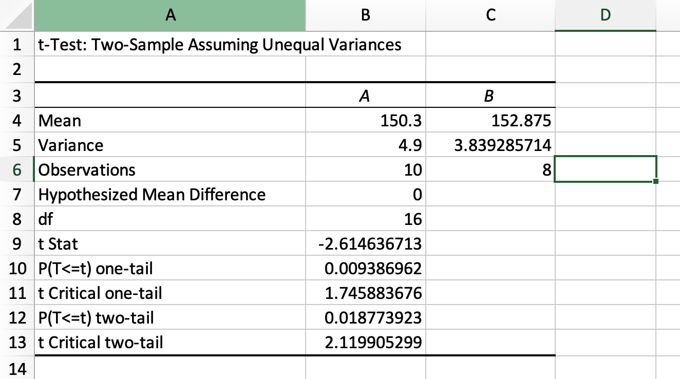 假设我们在这里进行的是双尾测试,P值为0.01877,小于0.05。因此,我们可以推翻原假设,两个样本可以被鉴定为具有统计学上显着的差异。