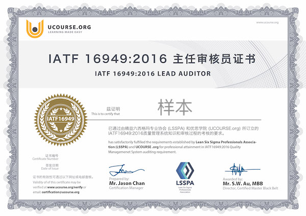 通过此考试,您将可以获得由Lean Six Sigma Professionals Association (LSSPA) 和 UCOURSE.ORG双重认可的IATF16949:2016主任审核员证书,此证书将证明你本人具有以下的知识和能力: