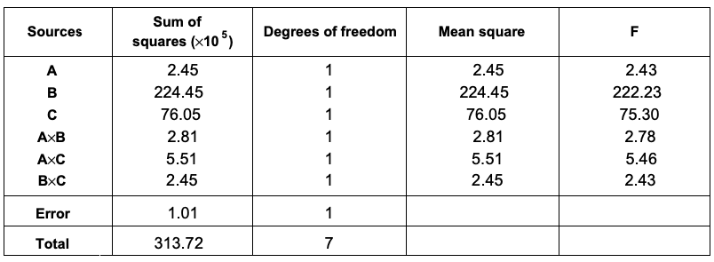 团队进行了8組,以2^3因子设计的实验,并记录结果。