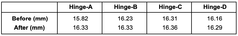 通过这样做,所有四个铰链的高度分布将更好地居中,并且两种类型的板的过程性能显着提高。
