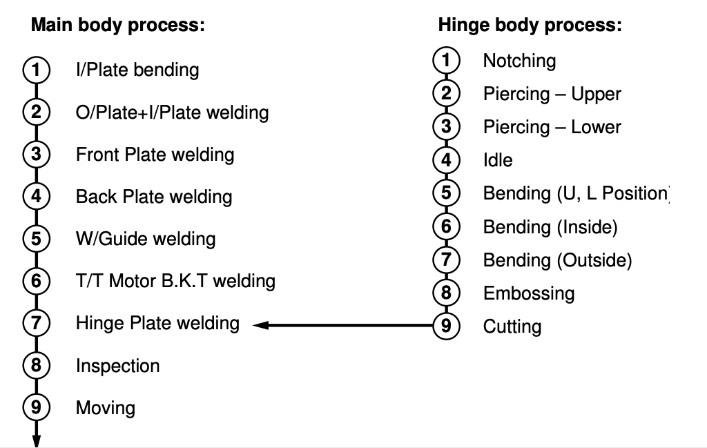 穿孔是在在制造铰链的过程中经过刺板。整个过程(Hinge Body)从板的切口开始,在上铰炼和下铰链上钻孔,然后弯曲、压花和切割。然后,铰炼板会在主体工序中(Main Body Process),焊接到微波炉的主体上。